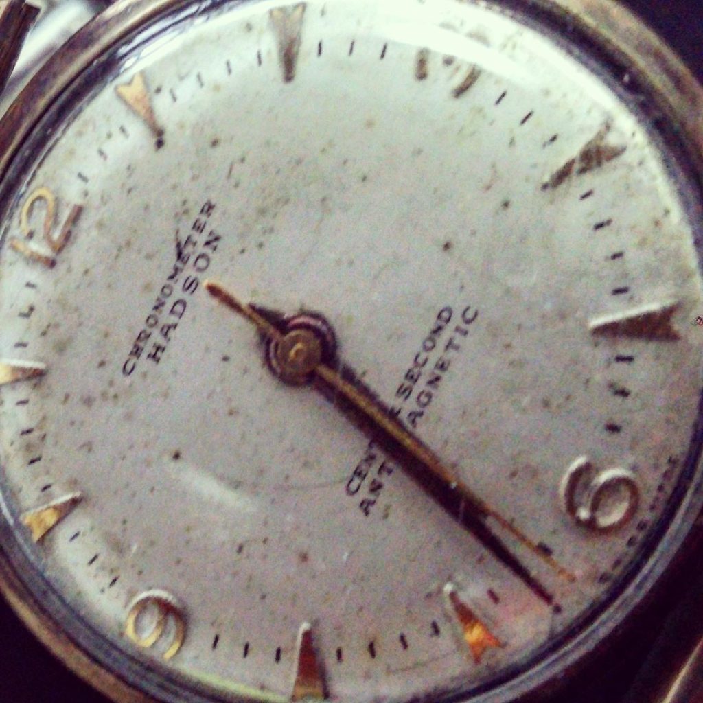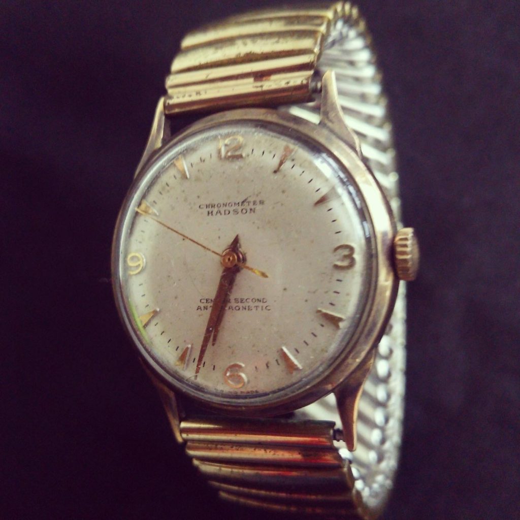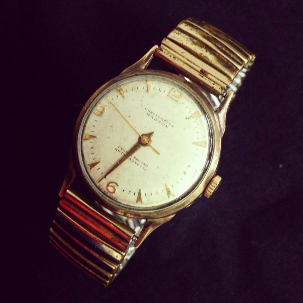 スイスハドソン社製14金ネジ巻式時計です。鑑定によれば1950代製造の時計です。文字盤に汚れが入っていますが、もちろんまだ現役で時を刻んでいます。時計時代の大きさはそれほど大きくなく「ボーイズ」と呼ばれる部類に入ります。