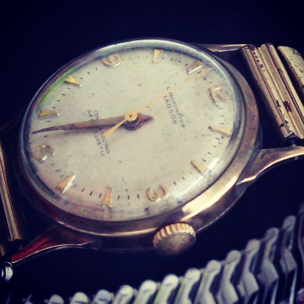 終戦を迎え戦地から返ってきた私の祖父が、商売で一山当てて購入した自慢の腕時計だったらしく、いわば形見の品となります。